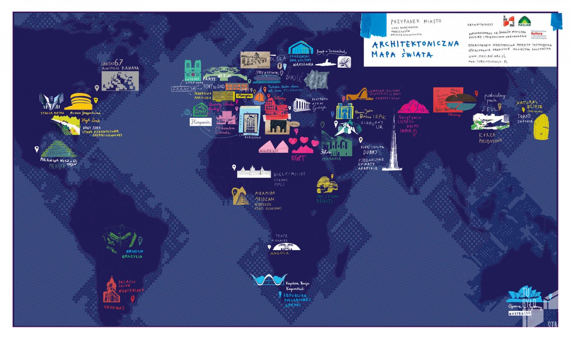 Mapa stanowi subiektywny miniprzewodnik po architekturze różnych epok i styli. Prezentujemy obiekty zarówno z czasów starożytnych - jak Partnenon w Atenach, Petra w Jordanii czy Piramida Nisz w El Tajin (Meksyk), jak i średniowiecznych – m.in. katedrę Notre Dame i Wielki Meczet w Dżenne, czy w końcu bardziej nam współczesnych – np. Jednostkę Marsylską Le Corbusiera, Operę w Sydney Jørna Utzona i Teatr Narodowy w Pekinie projektu Paula Andreu.