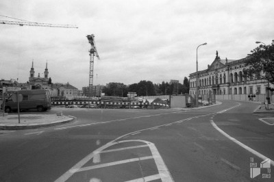 Plac Krasińskich. Budowa gmachu Sądu Najwyższego. Widok na plac Krasińskich ze skrzyżowania ulic Bonifraterskiej i Świętojerskiej. Po prawej stronie widoczny jest gmach pałacu Krasińskich. Lata 1996-97. Fot. Jacek Łagowski.