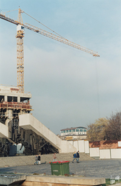 Plac Krasińskich. Pomnik Powstania Warszawskiego - widok z narozżnika ulic Miodowej i Długiej. Po lewej za pomnikiem widoczna jest budowa gmachu Sądu Najwyższego. W oddali widać nadbudowę budynku przy ul. Ciasnej 6. 27.11.1997. Fot. Małgorzata Kukowska