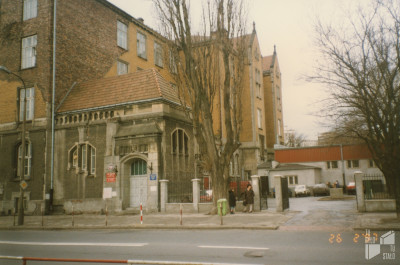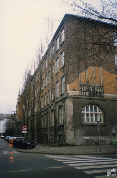 Ulica Dobra róg Drewnianej. Gmach szkolny przy ulicy Drewnianej 8, widok z ulicy Dobrej. 26.02.1997. Fot. Marta Nowosielska