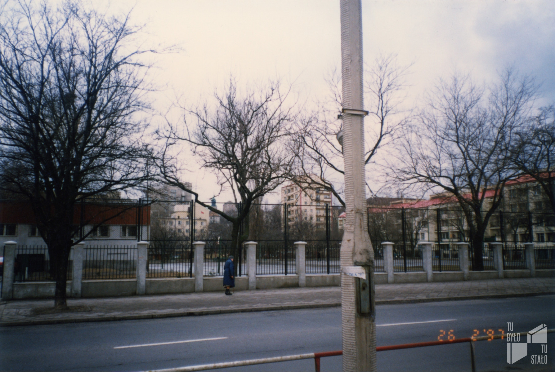 Ulica Dobra. Widok z ulicy Dobrej na teren boiska znajdującego za gmachem szkolnym przy ulicy Drewnianej 8. 26.02.1997. Fot. Marta Nowosielska