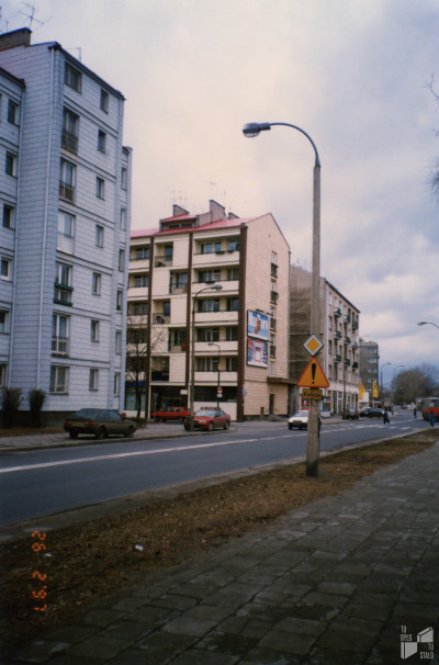 Ulica Dobra. Widok od strony skrzyżowania Dobrej z Leszczyńską w stronę wylotu ulicy Radnej i dalej skrzyżowania z ulicą Lipową.Od lewej widoczne są bloki osiedla Radna, przy Radnej 1/7 oraz 2/4. 26.02.1997. Fot. Marta Nowosielska