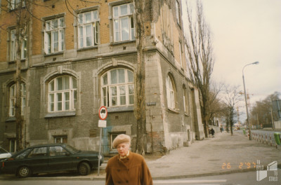 Ulica Dobra. Gmach szkolny przy ulicy Drewnianej 8, widok od strony ulicy Dobrej. 26.02.1997. Fot. Marta Nowosielska